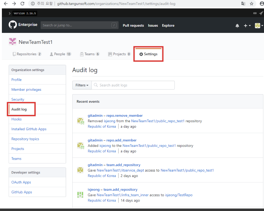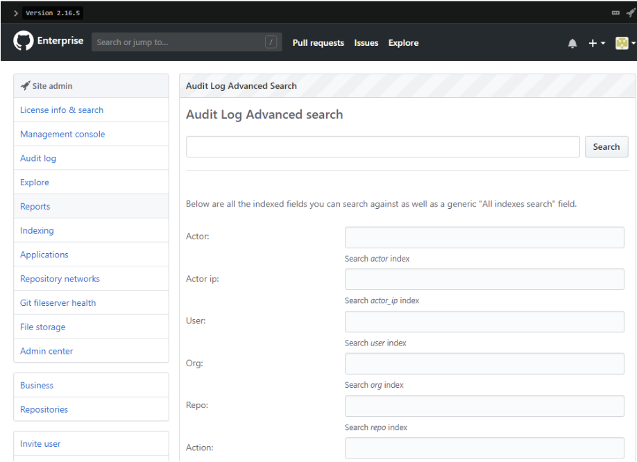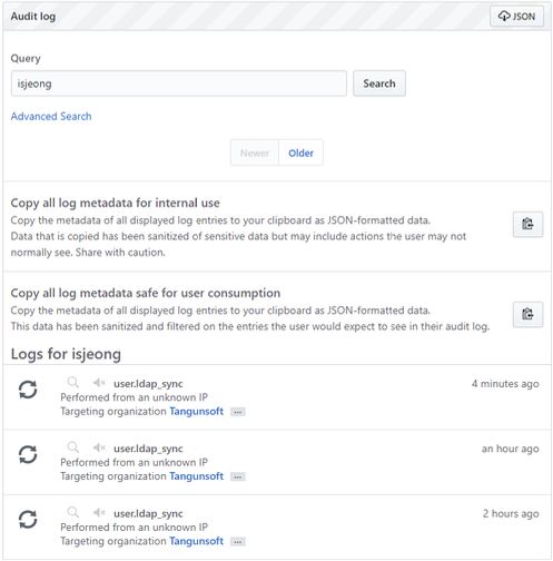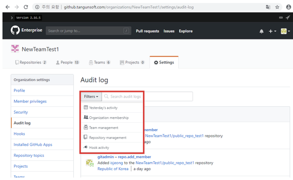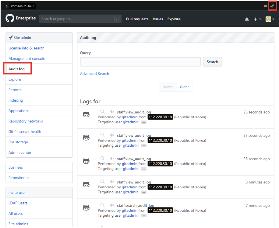 참고로 Site Admin의 Audit log 메뉴에는 해당 기능이 없습니다.