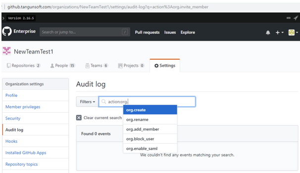 참고로 조직 내 Settings의 Audit log 메뉴에서는 조직(org) 및 팀(team) 등 키워드에 따른 하위 작업명을 검색 및 선택하여 조회가 가능합니다.