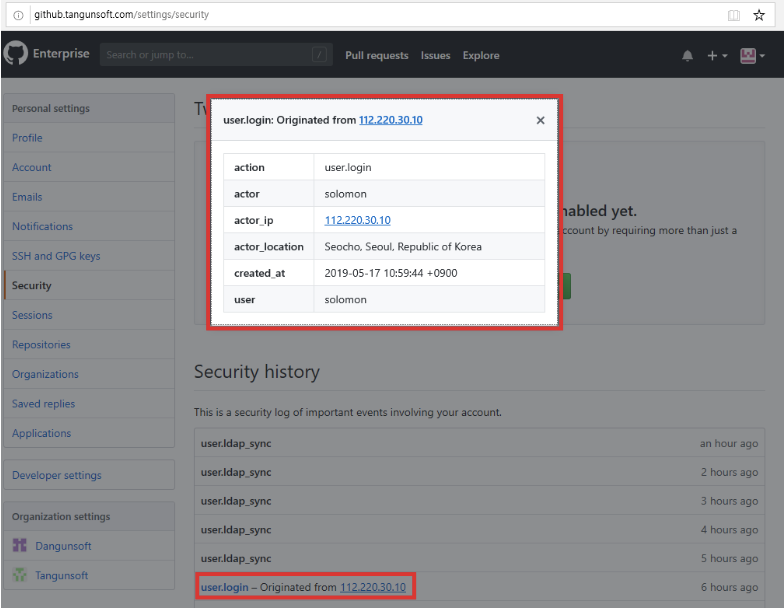 개인 Settings 메뉴 클릭 후 좌측의 Security를 클릭하시면 개인 로그를 조회하실 수 있습니다.