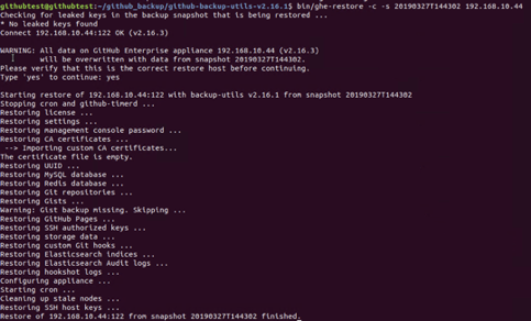 $ bin/ghe-restore -c -s 20190327T144302 [복원할 인스턴스의 IP]