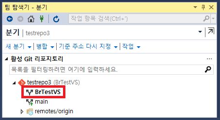 ③ 생성이 완료된 브랜치는 [활성 Git 리포지토리]에서 확인하실 수 있습니다.