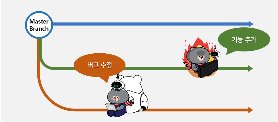 그건 동일한 프로젝트라 하더라도 버그 수정 및 신규 기능 추가 등 서로 다른 작업을 진행하는 경우가 있기 때문입니다. 그렇기 때문에 별도 브랜치(Branch)에서 작업을 진행해야 Master 브랜치를 유지하면서 작업을 할 수 있습니다.