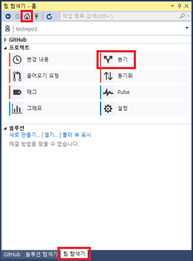 ① Visual Studio의 팀 탐색기에서 [홈] 버튼을 클릭하신 후 [분기] 버튼을 눌러주세요.