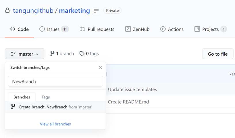 저장소에서 생성하고자 하는 브랜치의 원본을 선택하신 후 브랜치 이름을 입력 및 [Enter]를 누르면 브랜치(Branch)가 생성됩니다.