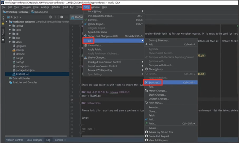 브랜치(Branch)는 GitHub Web(GitHub.com 또는 GitHub Enterprise Server), IntelliJ, VisualStudio에서 생성할 수 있습니다.