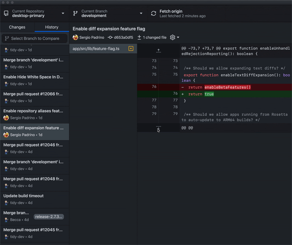 GitHub Desktop 2.8.2에 Apple 실리콘을 위한 기본 빌드가 포함되었습니다. 이제 M1 칩에서 기본 설정으로 GitHub Desktop을 실행하고 여백 숨기기, diff 확장, 저장소 이름 변경 등의 기능을 사용할 수 있습니다.