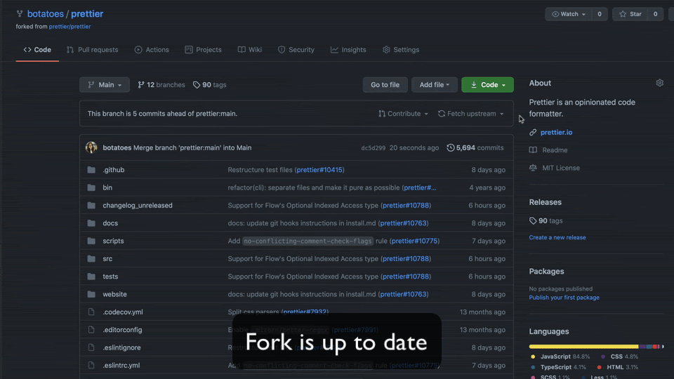 만일 Branch 간의 충돌이 없는 경우, fork의 Branch는 상위 Branch로 빠르게 전달되거나 병합될 것입니다. 충돌이 일어날 경우, 풀리퀘스트를 열어 문제를 해결하라는 메시지의 안내에 따라 해결하면 됩니다.