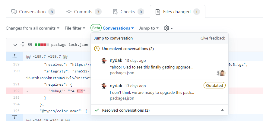 풀리퀘스트를 찾고 해결하기 위한 새로운 도구의 베타 버전이 출시되었습니다. 이제 풀리퀘스트에서의 대화를 더 쉽게 찾을 수 있습니다. 새롭게 추가된 branch 보호 옵션은 관리자가 풀리퀘스트를 병합하기 전에 모든 리뷰를 해결하도록 요청할 수 있습니다.