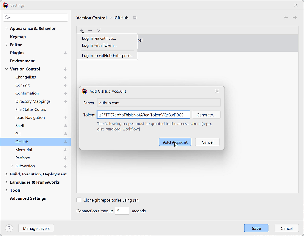 GitHub를 사용하기 전 GitHub 계정과 Rider를 먼저 연결해야 합니다. Rider의 Settings(설정)에서 Version Control(버전 관리) | GitHub로 이동하여 GitHub 계정 로그인 정보를 입력하세요. Rider에서 GitHub 계정으로 로그인하여 코드를 게시하고 가져올 수 있습니다.