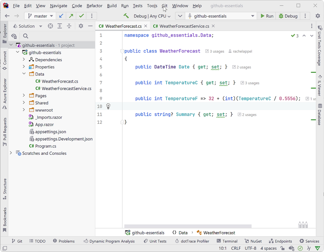 이제 GitHub의 작업을 편리하게 살펴볼 수 있습니다. Git | GitHub | Open on GitHub(GitHub에서 열기)를 선택하면 Rider가 디폴트 웹 브라우저를 열어 프로젝트의 저장소를 표시합니다. 매우 편리하죠!