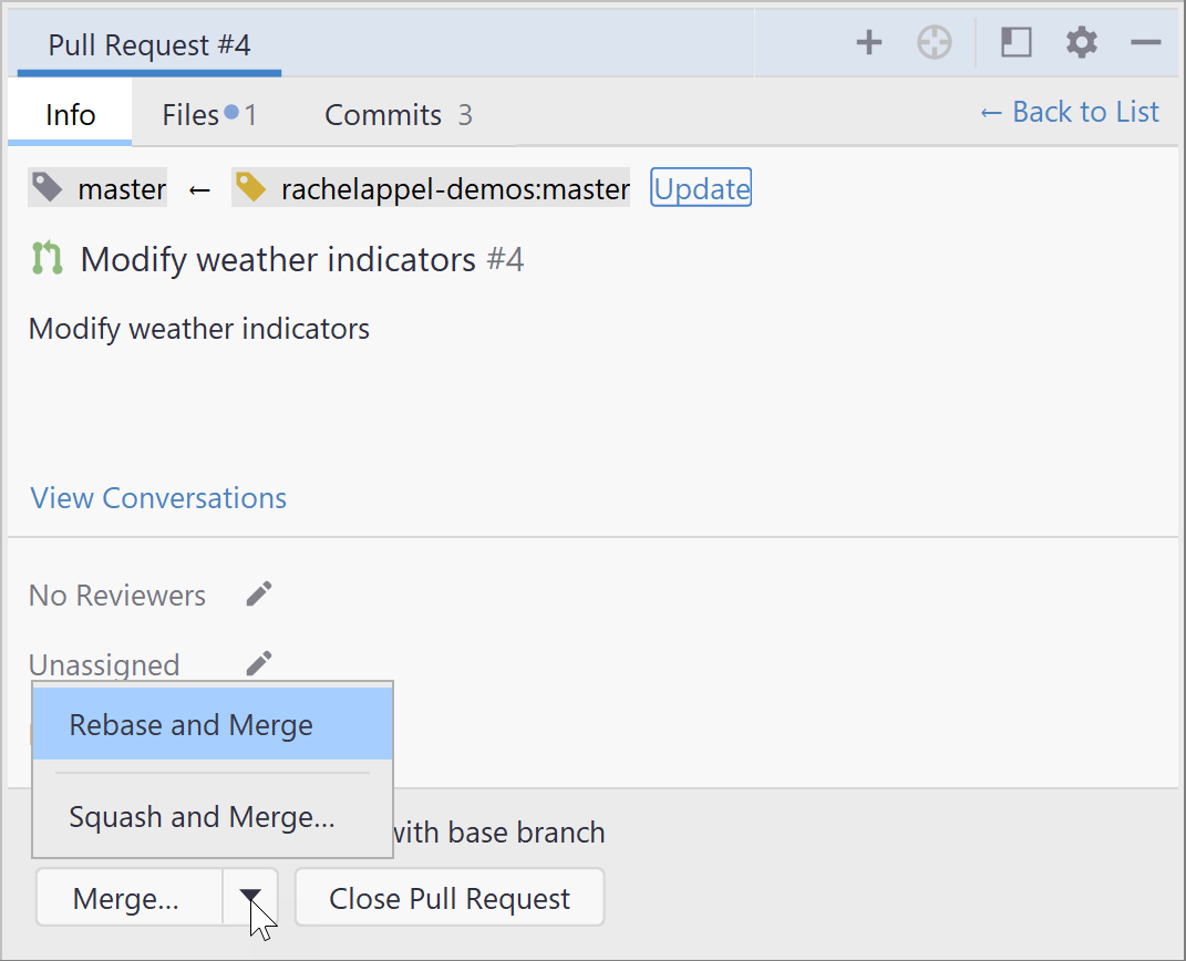 사용자가 풀 리퀘스트를 생성하면 Rider는 병합 여부를 묻고, Merge(병합), Rebase and Merge(리베이스 및 병합), Squash and Merge(스쿼시 및 병합)와 같이 다양한 병합 옵션을 제공합니다.