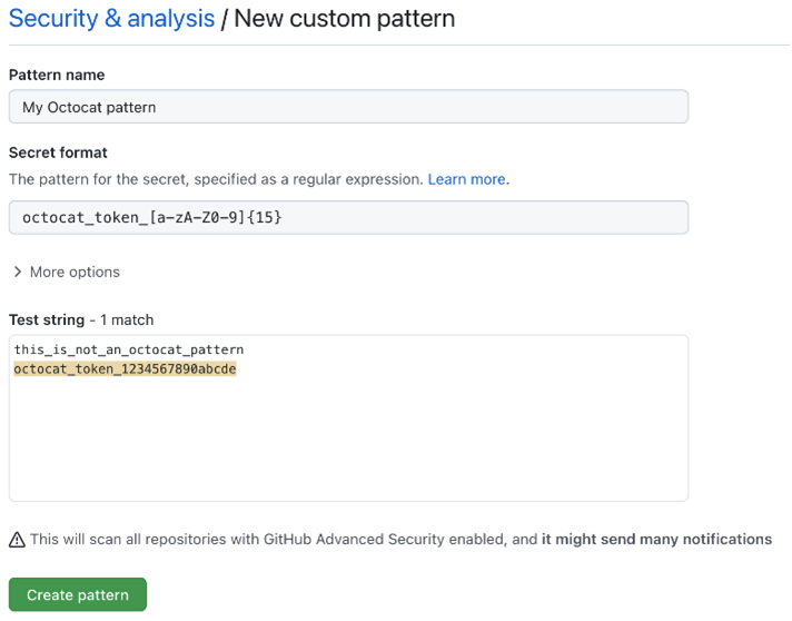 패턴을 편집하고 저장하면 Secret Scanning은 패턴과 일치하는 결과를 저장소의 모든 Git 기록과 새로운 커밋 전체에서 검색합니다. 패턴을 편집하고 이전의 패턴과 다르다면, 이전의 패턴으로 연결된 경고가 닫힙니다.