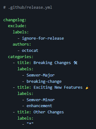 저장소 내에 .github 폴더에 release.yml 파일을 통해 릴리스 노트가 자동으로 생성되는 환경을 구성할 수 있습니다. 자세한 내용은 문서를 참고 부탁 드립니다.