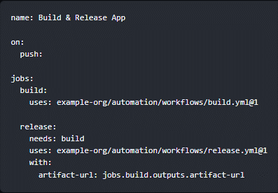 해당 기능은 이미 작성된 워크플로우를 새로운 워크플로우에서 사용 가능합니다. uses 문법으로 사용할 워크플로우 파일 경로를 명시하여 사용할 수 있으며, inputs, outputs 문법으로 기존 워크플로우와 새로 작성한 워크플로우간 데이터를 전달할 수 있습니다.