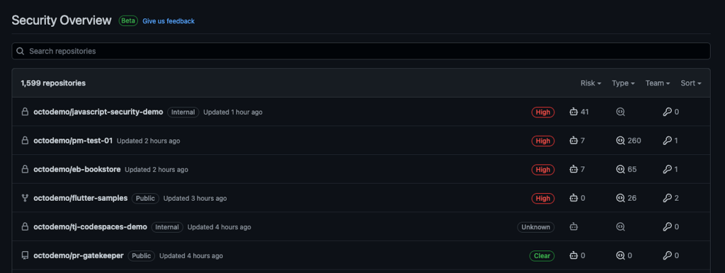 이제 모든 기업 고객은 보안 개요에 액세스할 수 있으며, 이를 통해 기업 전체의 보안 상태를 중앙 집중식으로 파악할 수 있습니다. 애플리케이션 보안 팀, 엔지니어링 리더 및 개발자는 Dependabot alerts, code scanning 및 secret scanning alerts 등을 모두 한 곳에서 볼 수 있습니다. 엔터프라이즈 계정의 코드 보안 탭에서 보안 개요를 찾을 수 있습니다.