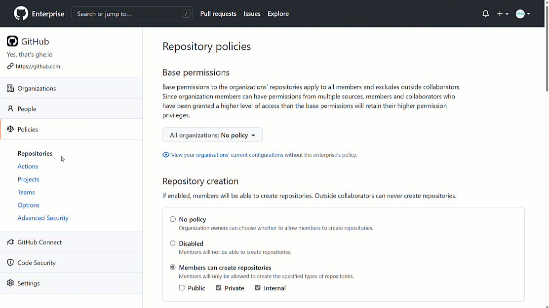 GitHub는 오랫동안 기업 간에 코드를 공유하고 organizational silos를 해소함으로써 팀이 더 빨리 혁신할 수 있도록 지원하는 플랫폼이었습니다. 모든 개발자와 기업이 innersource 사례를 쉽게 채택하고 보안과 감사 가능성의 균형을 맞출 수 있도록 GHES 3.7은 forking 경험, forking 정책 및 repository 생성 정책을 다양하게 개선합니다. 아래 몇 가지 예가 있습니다.