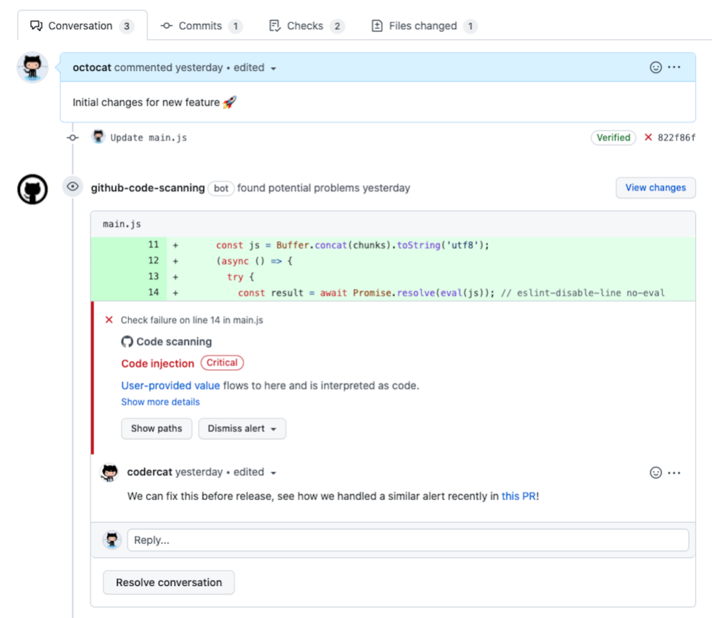 보안 취약성의 영향을 더욱 쉽게 평가할 수 있도록 코드 스캔 경고를 보다 협업적이고 접근하기 쉬우며 관련성이 높은 것으로 만들고 있습니다. 이제 보안 경보를 대화형 주석으로 추가하여 pull request의 대화 탭에 표시합니다. 개발자는 이러한 주석의 코멘트를 작성하고 기존의 모든 기능을 사용하여 경고를 효과적으로 분류할 수 있습니다(경로 표시, 경보 해제 및 세부 정보 표시 포함).