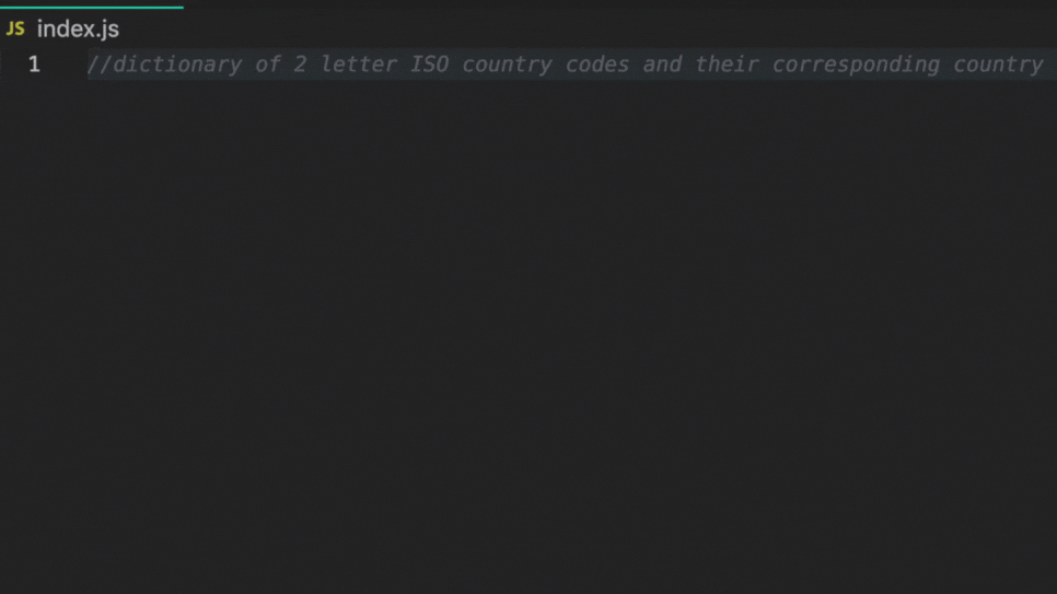 GitHub Copilot에 두 글자로 된 ISO 국가 코드와 해당 국가 이름의 사전을 만들도록 지시하는 주석을 작성하여 사용해 보세요. 주석을 작성하고 처음 몇 줄의 코드는 GitHub Copilot이 원하는 결과를 생성하는 데 도움이 됩니다. 시각적 표현은 아래 GIF를 참고하세요!