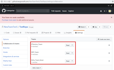 IT서비스팀, ERP팀, 인프라팀 하위팀(Infra_Team_Inner)에 저장소 접근 권한 부여한 후 팀별 접근 가능 여부 확인