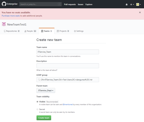 조직 내에 Private 저장소 생성 및 팀별 권한 부여