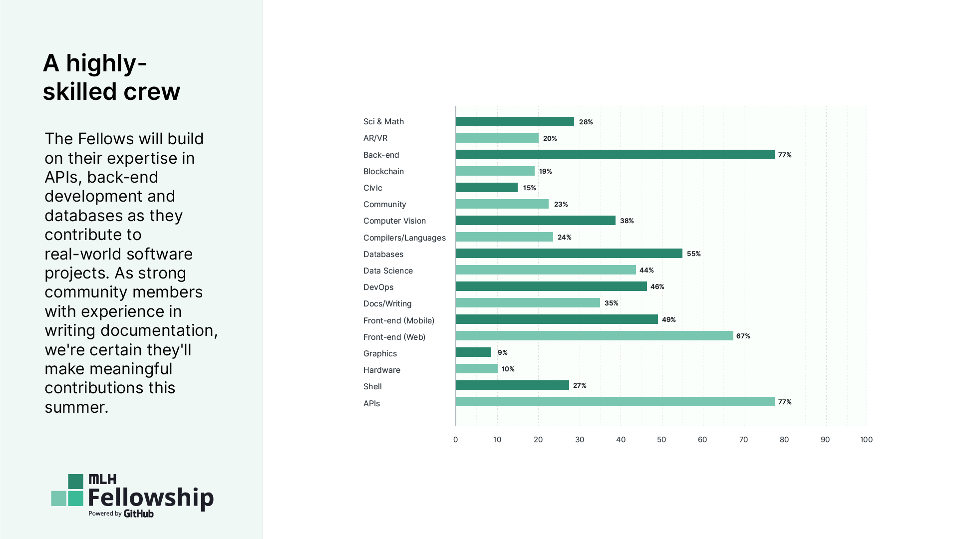 오늘날 금융에서 교통, 보건, 에너지까지 거의 모든 비즈니스들은 소프트웨어 비즈니스입니다. 그리고 소프트웨어 비즈니스들은 오픈소스, 프로젝트 유지를 위한 신규 개발자들, 또 신선한 아이디어와 새로운 관점에 달려있습니다.많은 기업들은 차세대 소프트웨어 개발을 위해 MLH Fellowship을 후원해 왔습니다.