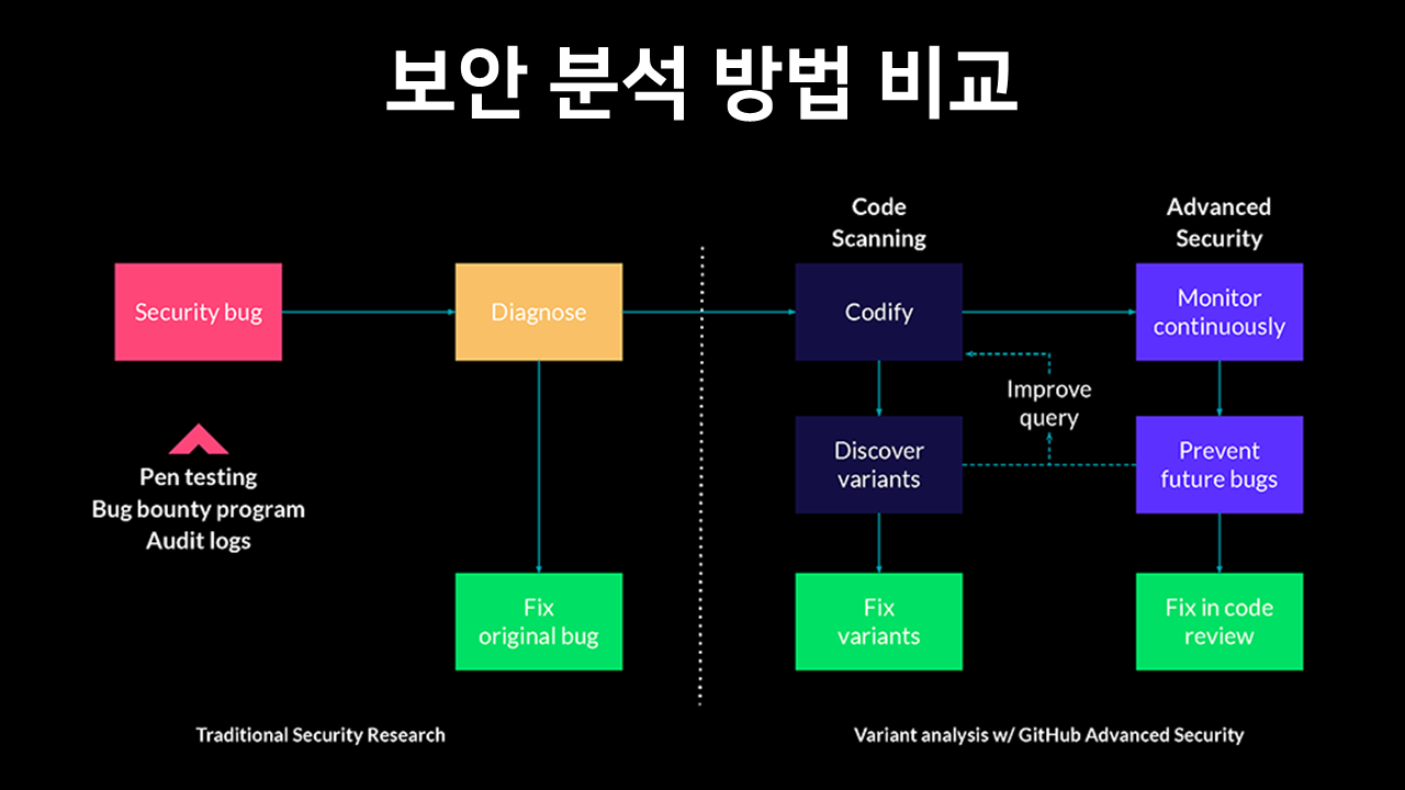 반면 GitHub의 Code Scanning 방식은 발견된 버그들을 분석하는 과정에서 그 버그를 찾기 위한 Query를 코드화합니다. 그리고 이 Query를 통해 이와 비슷한 유형의 버그들을 모두 찾을 수 있도록 query를 발전시키고 정제합니다. 이렇게 발생한 query를 전체 코드베이스에 수행하고 관련된 버그들을 모두 찾아 수정합니다. 그리고 동일한 버그가 발생하지 않도록 이러한 버그 분석은 자동화된 워크플로우에 포함됩니다.