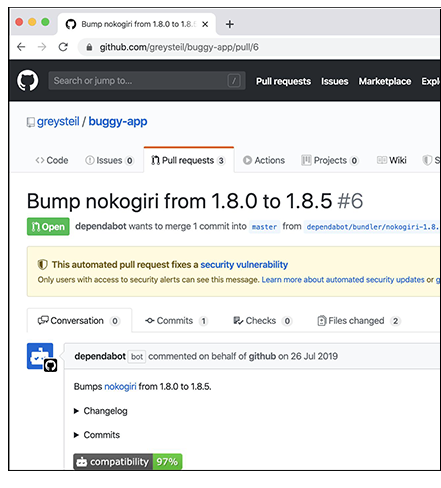위와 같이 보안 취약성 알림이 오면 이 알람은 패치하는 버전으로 업그레이드할 수 있도록 자동으로 Pull Request를 생성합니다. 각 프로젝트의 관리자들은 이 Pull request를 리뷰하고 승인하는 것으로 업그레이드가 이루어집니다.