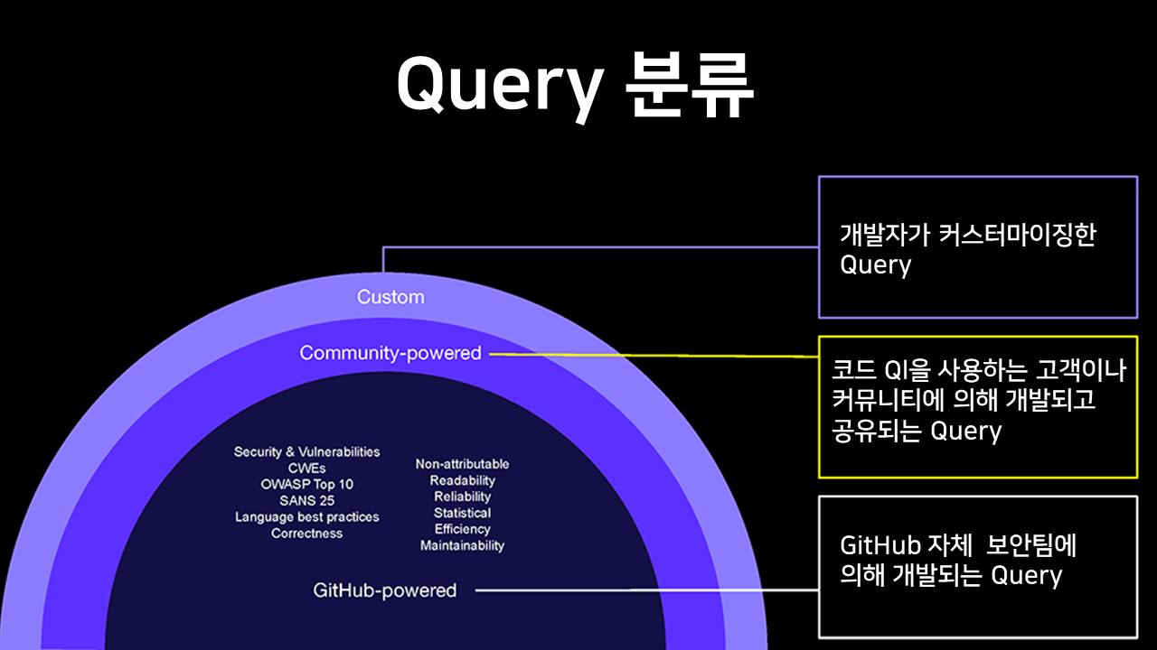 코드분석을 수행하는 Query는 크게 3가지로 나눌 수 있습니다. 먼저 GitHub-Power은 GitHub 자체 보안팀에 의해 개발되는 Query입니다. GitHub에는 자체 보안팀이 있어 계속해서 Query를 업데이트되고 공유되고 있습니다. Community-Power은 코드 QL을 사용하는 보안 전문가나 커뮤니티의 보안 전문가에 의해 개발되고 공유되는 Query입니다. 그리고 마지막으로 개인 개발자들이 커스터마이징 해서 사용하는 Query가 있습니다.