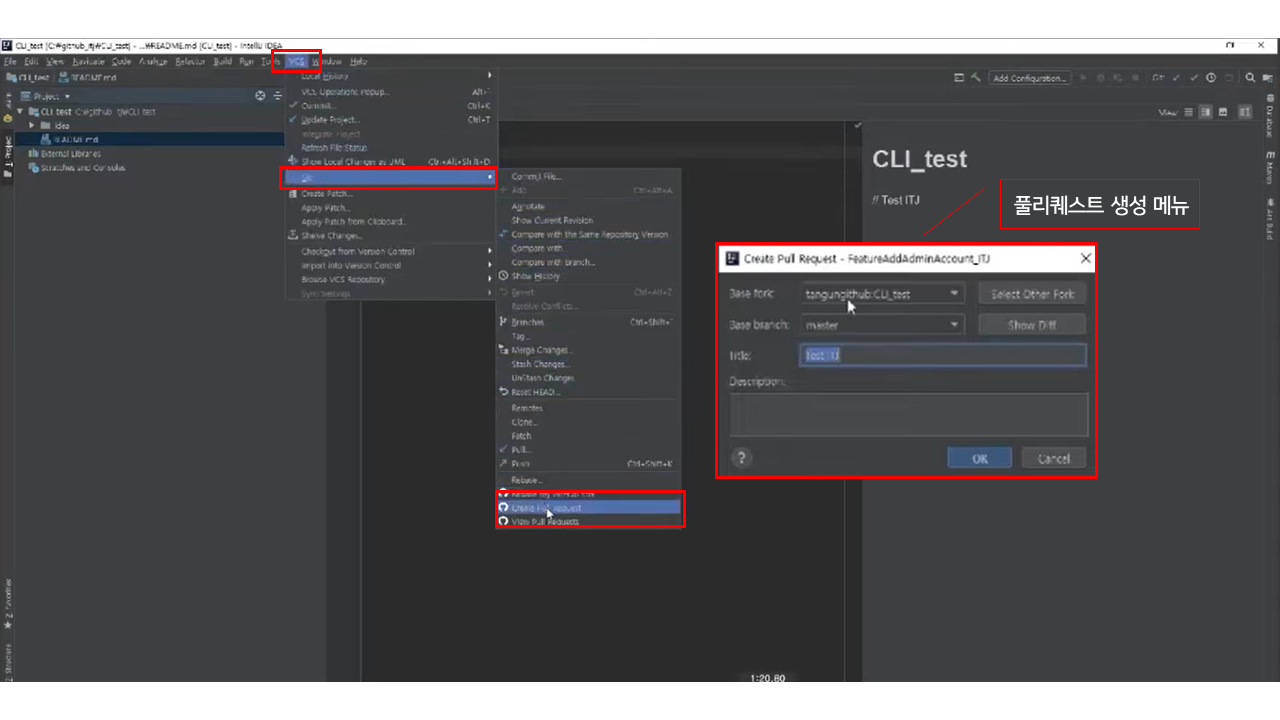 커밋이 완료된 후 VCS 탭의 Git을 누르시면 풀리퀘스트 생성 메뉴가 나옵니다.