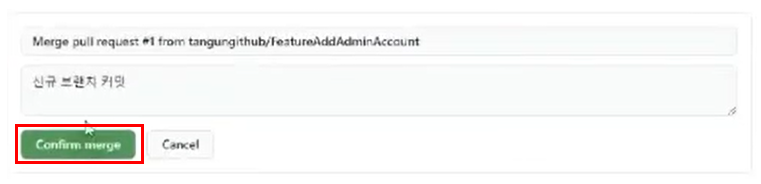 마스터 브랜치에 풀리퀘스트를 병합하려면 Confirm Merge 버튼을 누르시면 됩니다.
