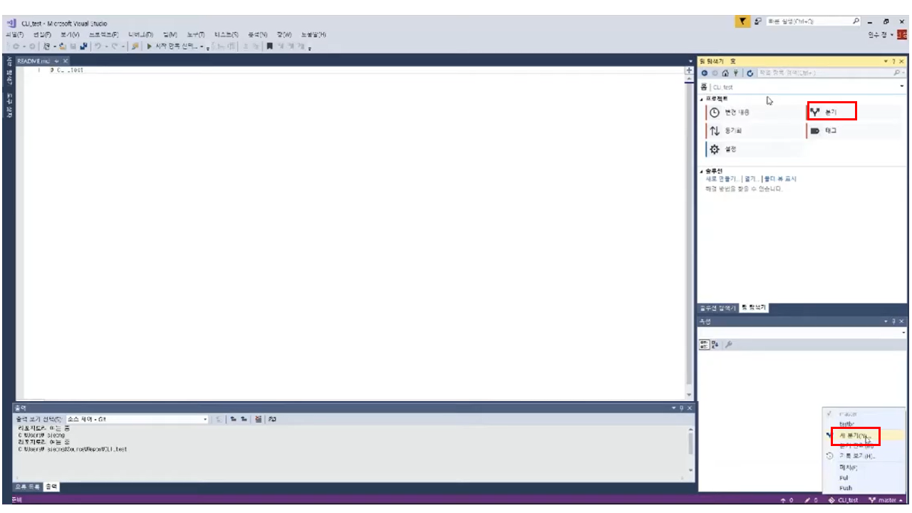 ① 팀 탐색기에 분기 또는 우측 하단에 새 분기 메뉴를 클릭해서 새로운 브랜치를 생성해 주세요.