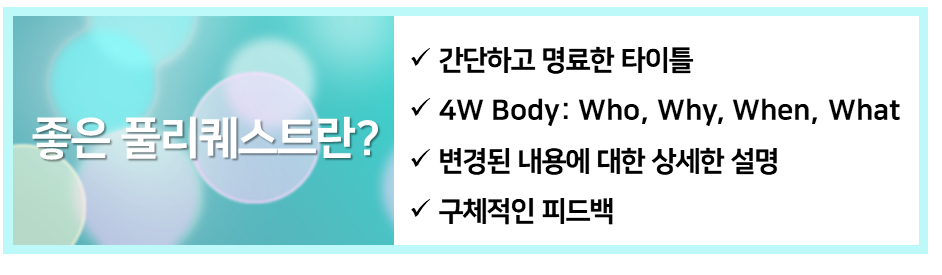 먼저 간단하고 명료한 타이틀, 그리고 Who, Why, When, What이 들어간 Body와 변경된 내용에 대한 상세한 설명,