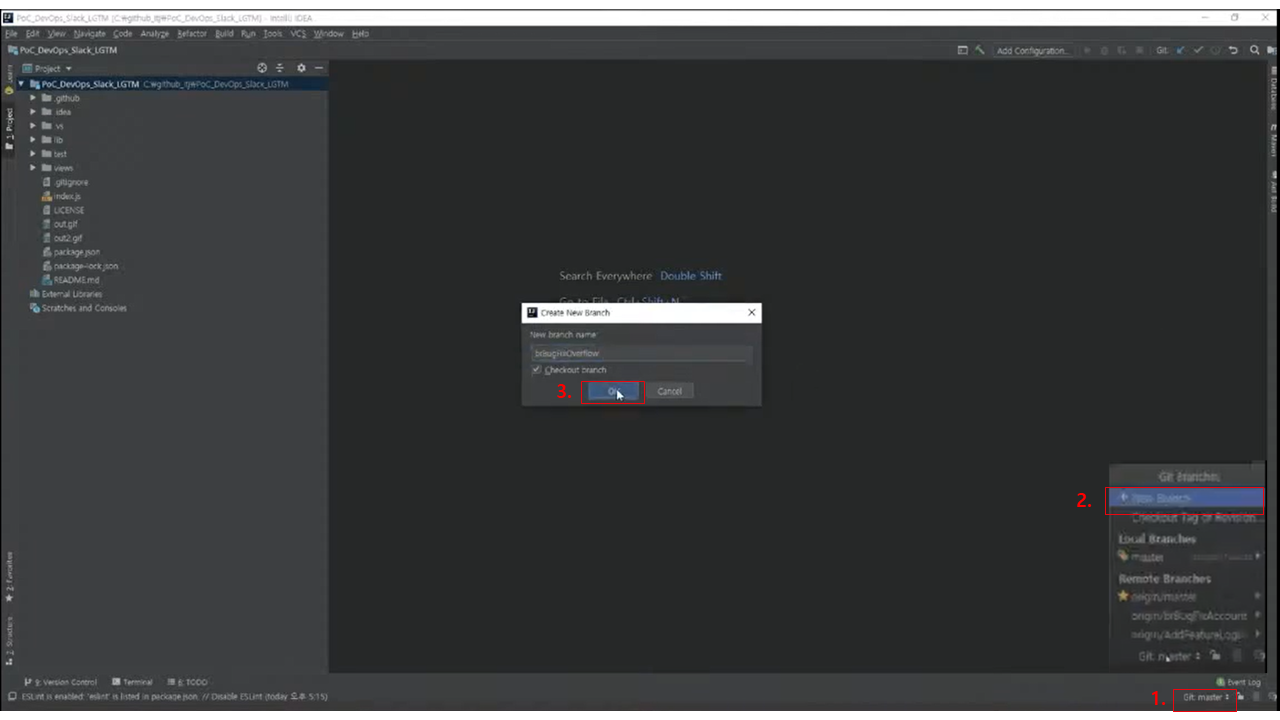 ① 우측 하단의 메뉴를 이용해 새로운 브랜치를 생성하세요.
