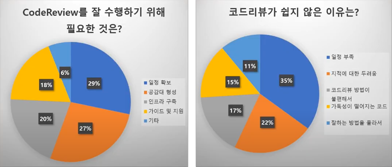 개발자들이 코드리뷰가 쉽지 않은 이유는 일정 부족(35%), 지적에 대한 두려움(22%), 코드 리뷰 하는 방법이 불편해서(17%), 가독성이 떨어지는 코드(15%) 순서입니다. 그래서 코드리뷰를 잘 수행하기 위해서는 일정 확보(29%)가 필요하다는 의견이 가장 많았고 그 뒤를 이어 공감대 형성(27%), 인프라 구축(20%) 등이 뒤를 이었습니다.
