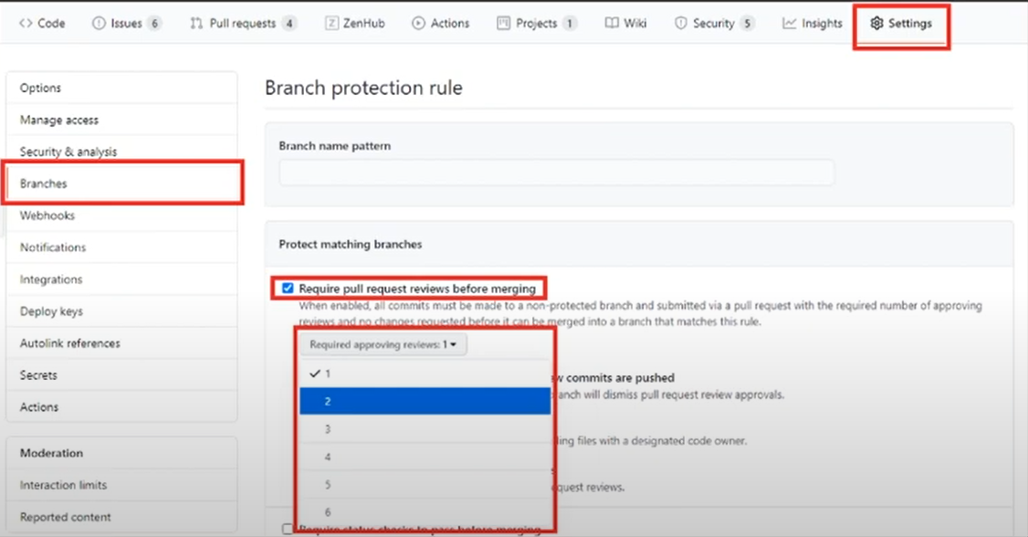 설정 메뉴에서 브랜치 탭을 선택하시면 브랜치 보호 정책을 보실 수 있습니다. 최소 리뷰어 수를 설정하시면 최소 리뷰어 수를 충족한 경우에만 병합이 가능해집니다.