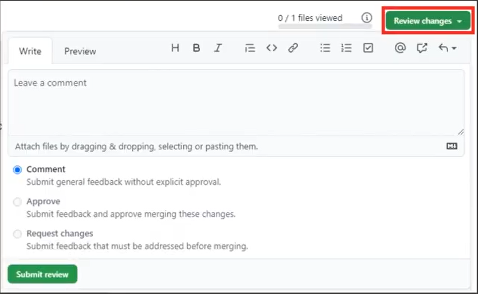 마지막으로 "Review changes"를 누르시면 작성한 코멘트의 상태값을 설정하거나 변경하실 수 있습니다.