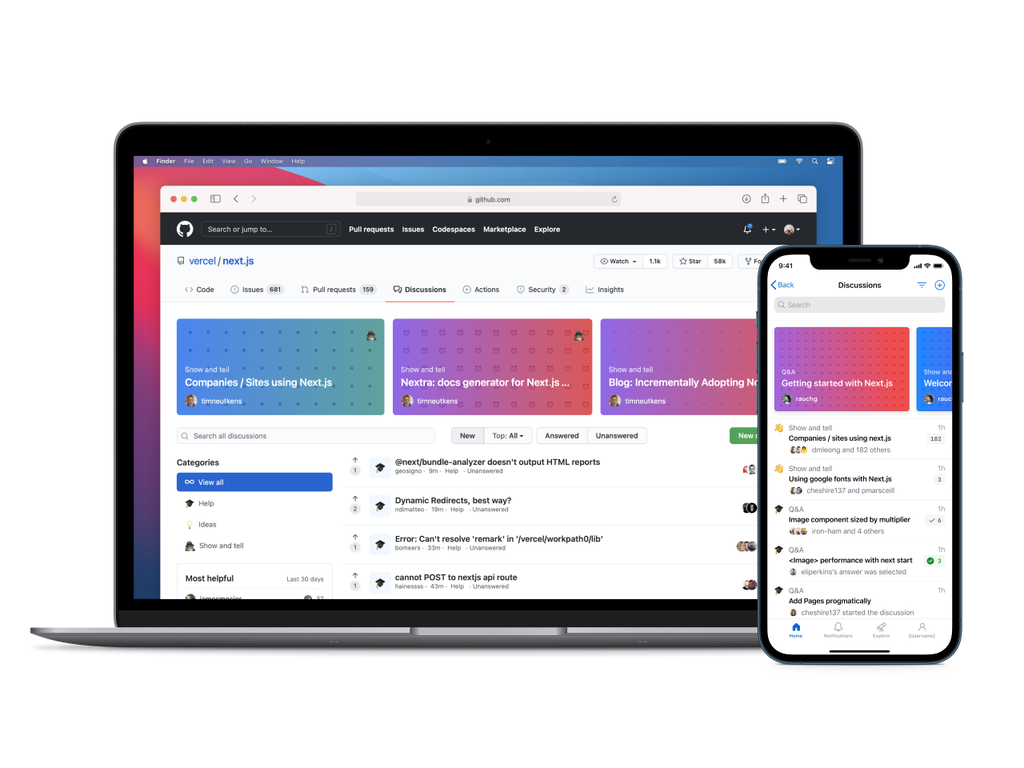 Discussions는 올해 초 제한된 베타 버전으로 제공되었고 Vercel, Gatsby, Prisma, Laravel과 같은 수백 개의 오픈 소스 커뮤니티와 협력하여 Discussion을 위한 맞춤 설정 가능한 카테고리 기능, GitHub 알림과의 통합과 같은 많은 새로운 기능을 추가했습니다.