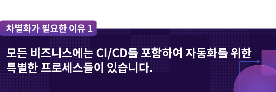 단순히 CI/CD 프로세스를 도입하면 DevOps를 구축할 수 있을 거라 생각하시는 분들도 계실 것입니다. 하지만 지난 시간에도 알려드렸듯이 CI/CD는 DevOps의 핵심 요소 중 하나일 뿐입니다. 성공적으로 DevOps를 구축하기 위해서는 또 다른 요소가 필요한데요. 그 요소는 바로 차별화입니다. 그러나 여러 이유로 차별화된 DevOps까지는 필요하지 않다고 생각하시는 분들이 계실 텐데요.